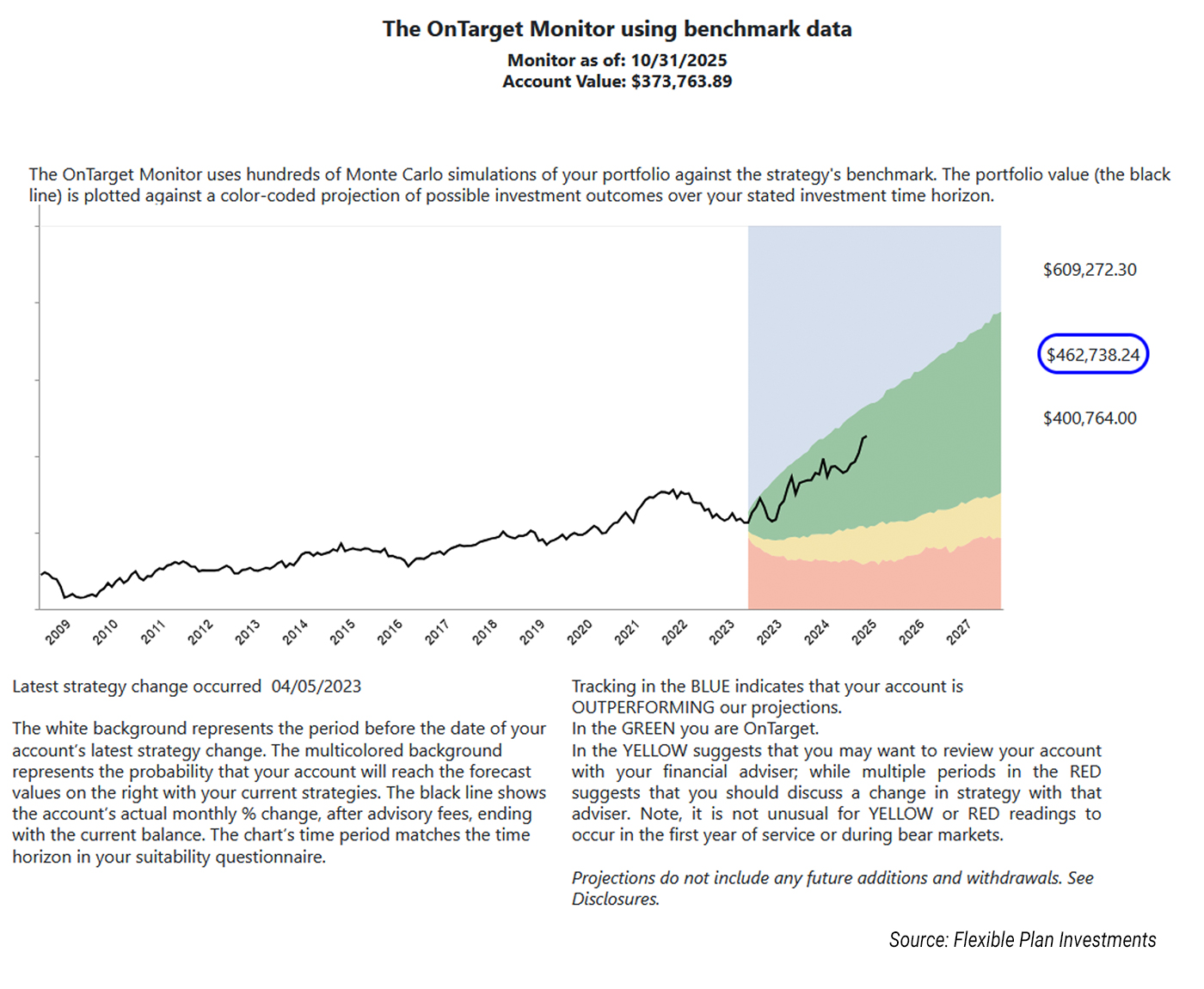 That’s why our clients and advisers should lean on the OnTarget Monitor (see “How to judge success” sidebar). It’s the scoreboard that matters for your household: a personalized benchmark built from your suitability answers (goal, horizon, risk tolerance) and your actual strategy mix. If the black line (your after-fee value) is in the green or blue, you’re on pace—regardless of what an index did last week. If it drifts to the yellow or red, that’s a timeout and a review—not a panic.