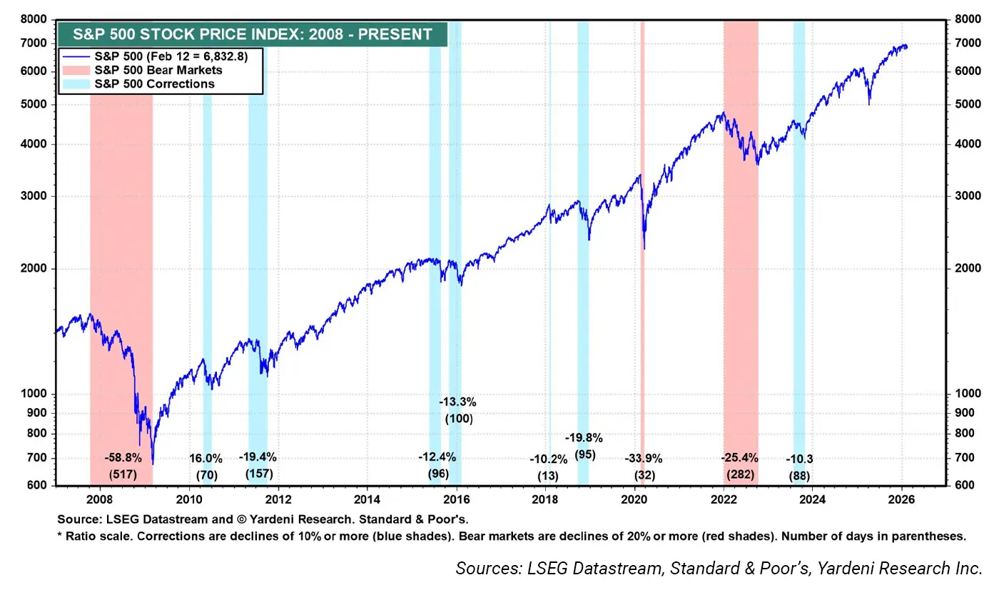 Since 2008, the S&P 500 has experienced numerous market pullbacks—some relatively modest, others more severe. Many of the smaller declines, often described as “baby bear” markets, were eventually followed by a resumption of the broader uptrend.