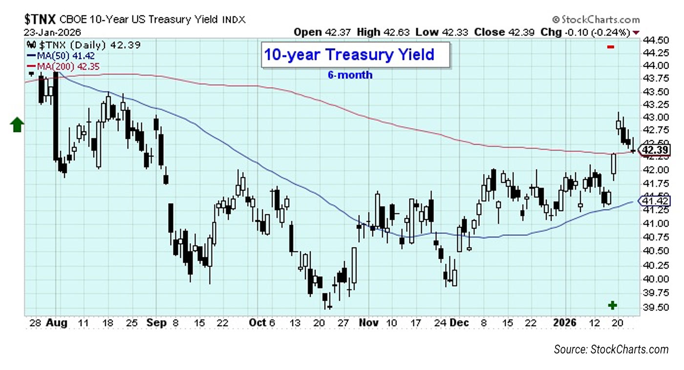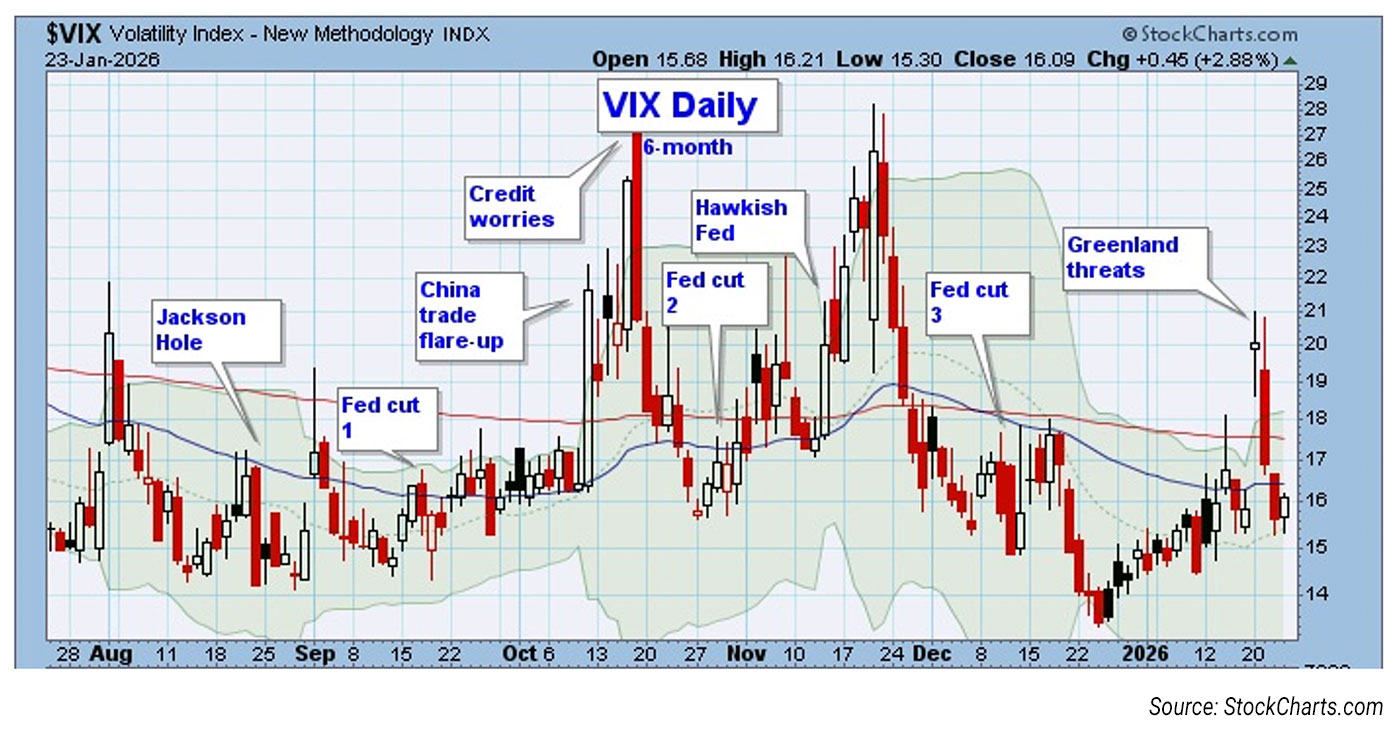 After hitting an all-time high just a week and a half ago, the major equity indexes went into another tariff-induced swoon, only to reverse on the Greenland news. Once again, we are presented with a series of higher highs and lower lows that is characteristic of a rising trend. This mirrors the price action we have seen develop repeatedly over the last three years.