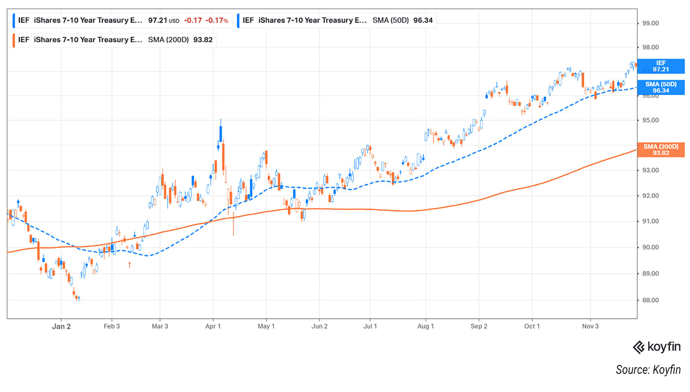 The iShares 7-10 Year Treasury Bond ETF (IEF), which tracks intermediate-term Treasury bonds, finished last week above both its 50-day and 200-day moving averages.