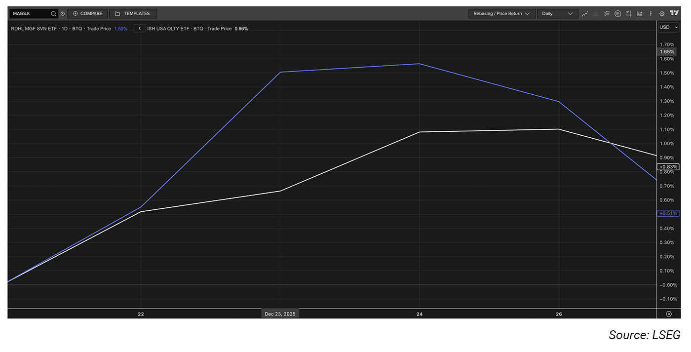 Large-cap indexes held near recent highs but lacked momentum, reflecting more consolidation than conviction. Leadership remained narrow, with defensive and quality-oriented names holding up better than higher-beta ones, such as the “Magnificent Seven.” The following chart compares the performance of the Magnificent Seven, represented by MAGS, with quality stocks, represented by QUAL. The higher-beta names faced more pressure going into the weekend.