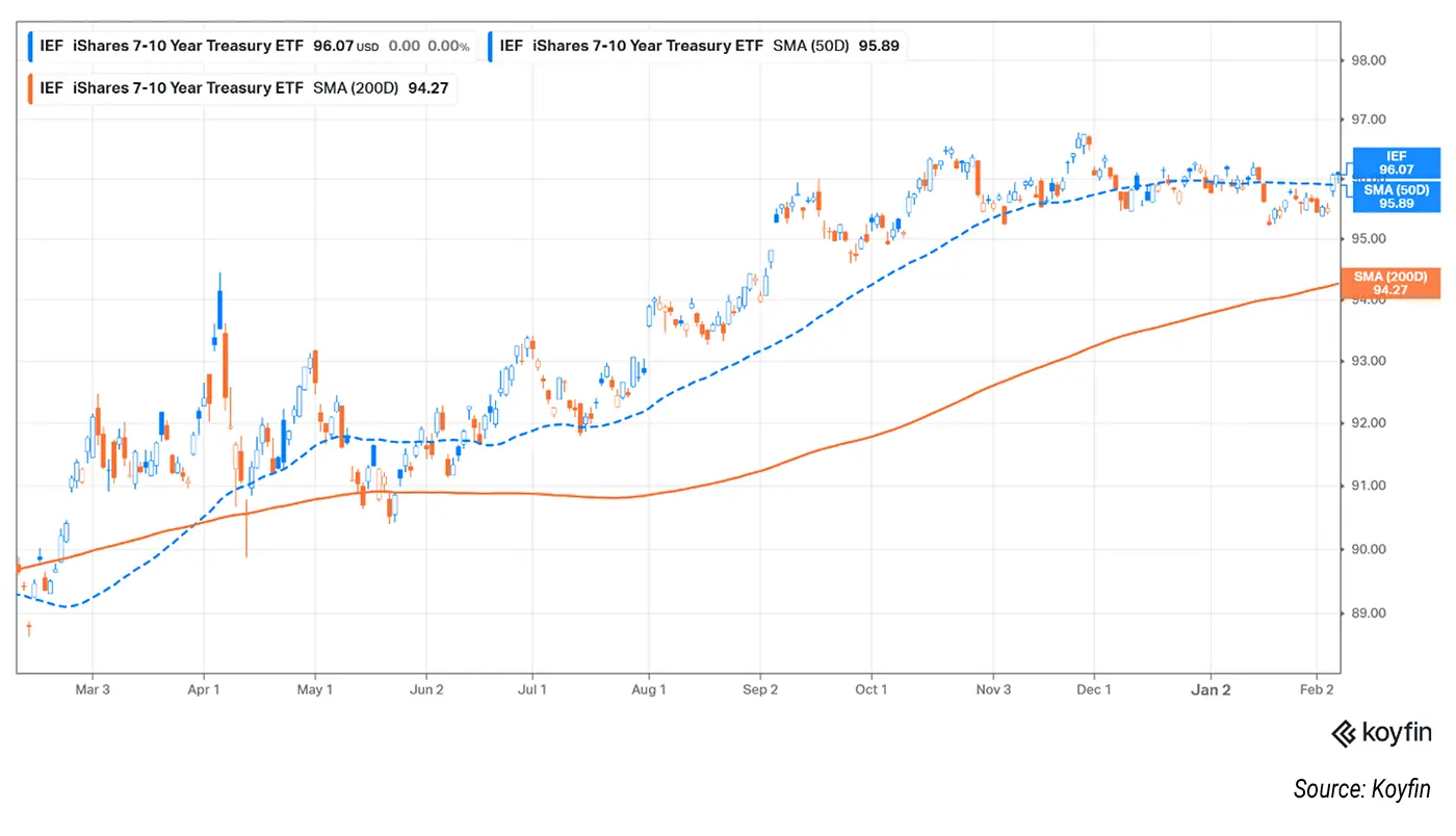 The iShares 7-10 Year Treasury Bond ETF (IEF), which tracks intermediate-term Treasury bonds, finished last week above both its 50-day and 200-day moving averages. Bond prices remain near their 52-week highs.