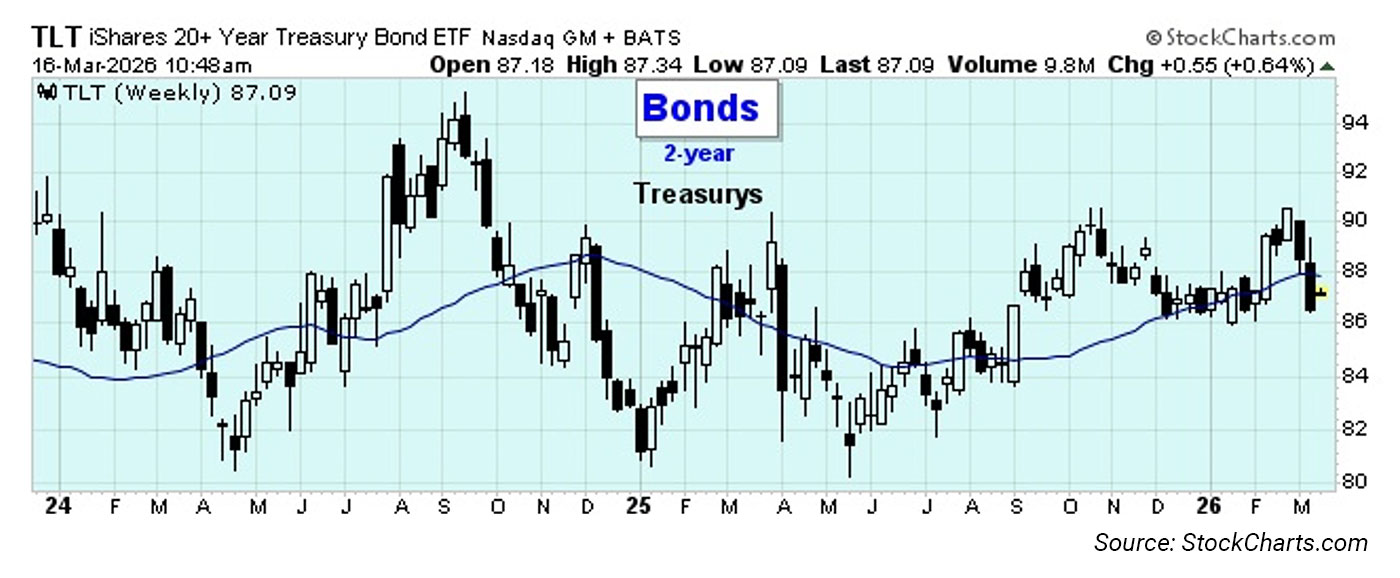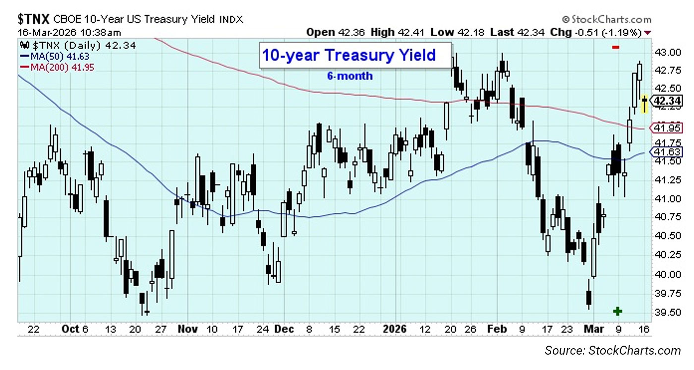 Yields broke higher last week as rising oil prices dominated the headlines and cast doubt on the prospects for manageable inflation. Yields on the 10-year government bond rose back to their intermediate-term high-water mark. Monday’s action reversed precisely at that point. In the past, yields have been very range-bound and respectful of the trending highs and lows. So this could be the start of a new direction for rates, although they are also likely tied to the trend in oil prices and the Middle East conflict.