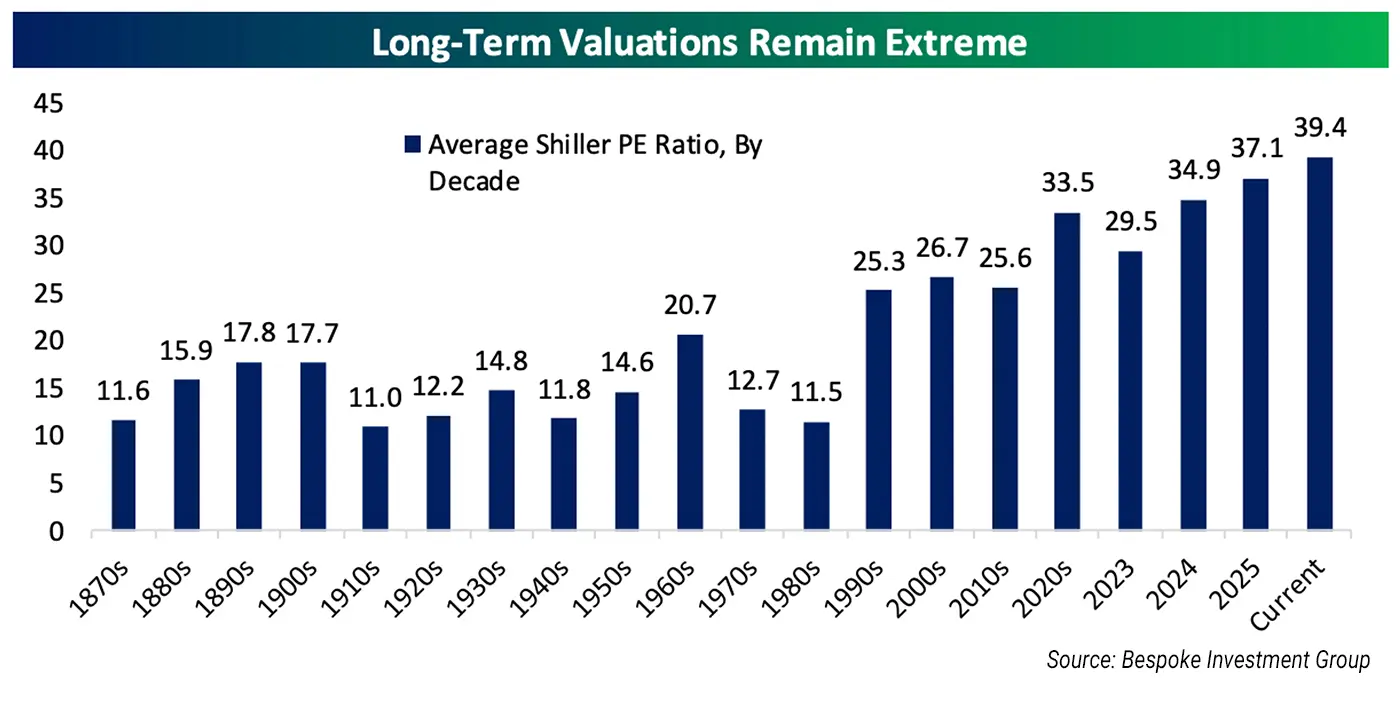 These geopolitical tensions are unfolding at a time when equity valuations are quite stretched. Bespoke Investment Group noted that the average Shiller P/E ratio by decade is currently at its highest level. While this doesn’t mean a correction, recession, or bear market is imminent, it does suggest that equities could face a tough patch without much of a spark.