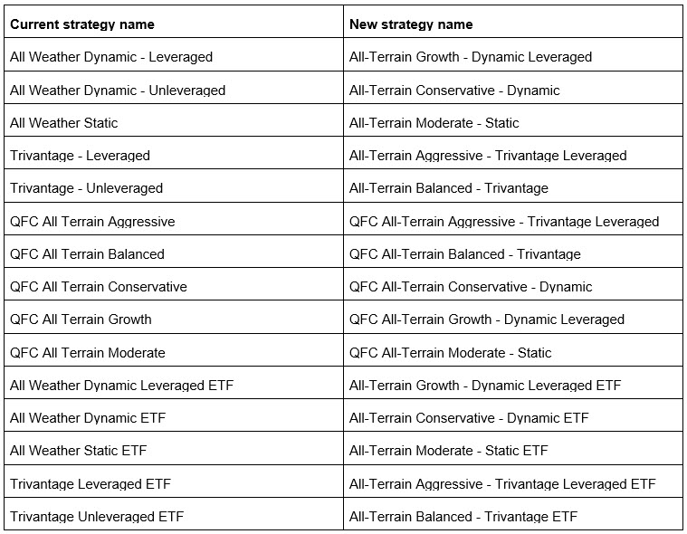 Several All Weather, QFC All-Terrain, and Trivantage strategies will have updated names beginning November 5, 2025, to better reflect their purpose and positioning.