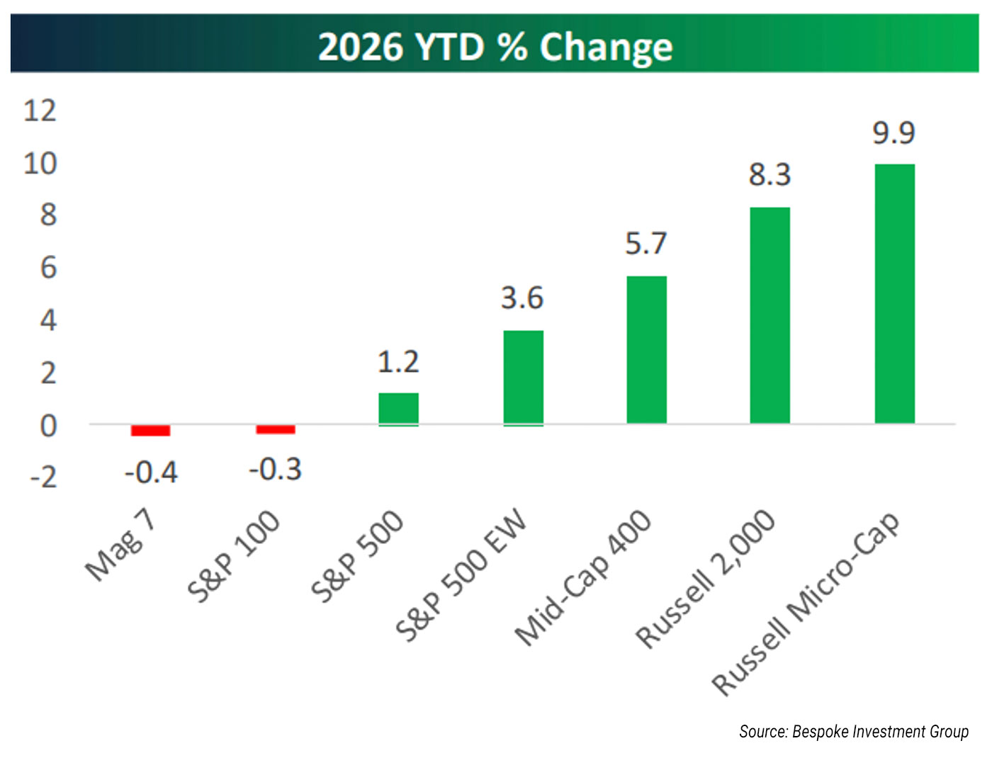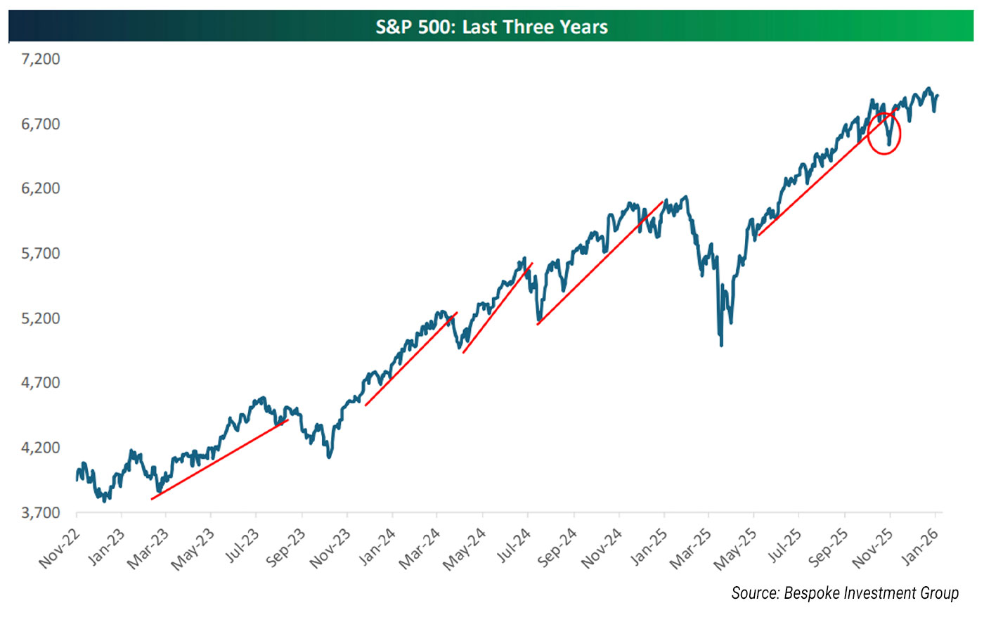 After hitting an all-time high just a week and a half ago, the major equity indexes went into another tariff-induced swoon, only to reverse on the Greenland news. Once again, we are presented with a series of higher highs and lower lows that is characteristic of a rising trend. This mirrors the price action we have seen develop repeatedly over the last three years.