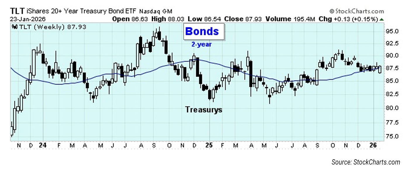 Although yields have moved above and below their shorter-term moving average since September, it was encouraging that the longer-maturity TLT bond ETF was holding above its weekly moving average. That changed last week, when prices appeared to break down amid geopolitical concerns and a declining U.S. dollar. (See the gold discussion below for more on this dynamic.)