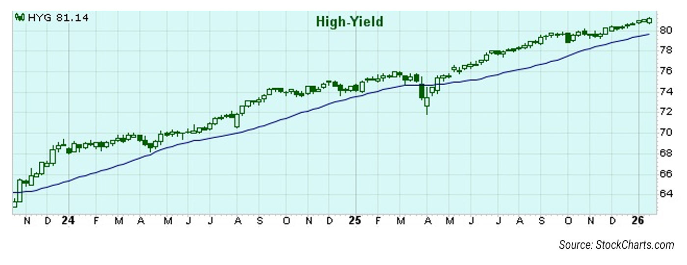 Meanwhile, the high-yield bond market continues to move higher with stock prices. Support from stocks and expectations for lower interest rates have been pushing this hybrid bond higher. As we have noted for more than nine months, the trend continues to favor this asset class in the near term.