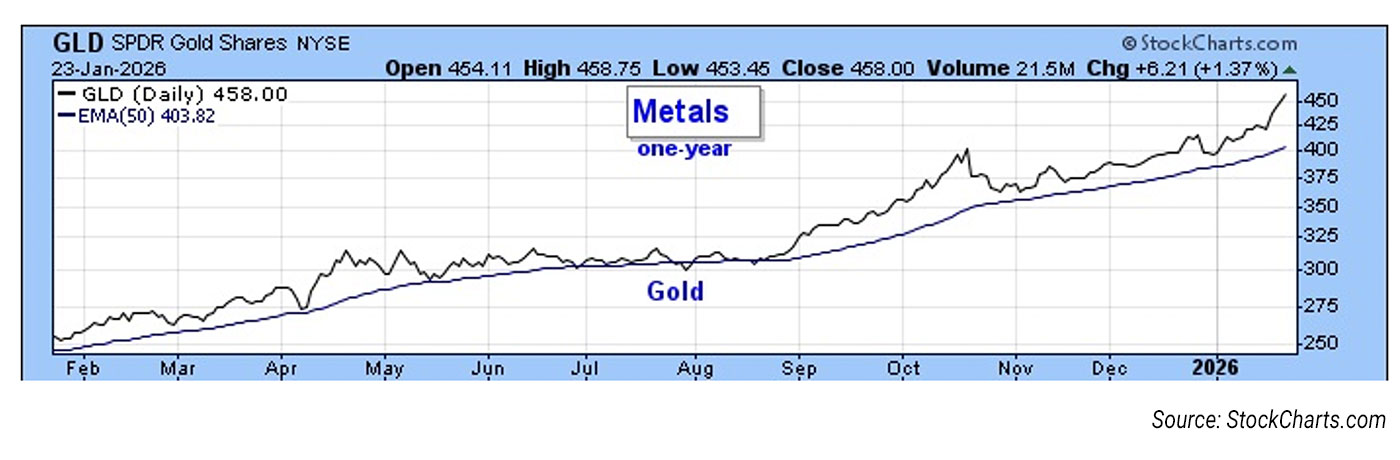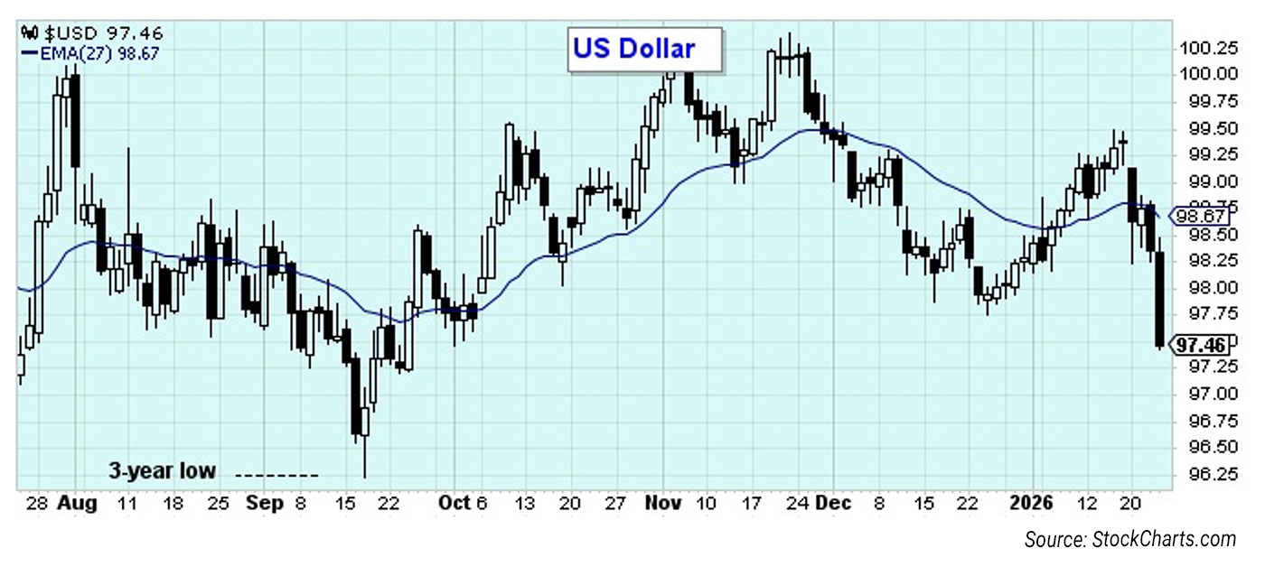 The traditional contrarian relationship between gold and the U.S. dollar continued. As the following chart shows, the dollar sold off sharply amid geopolitical tensions tied to tariffs and developments related to Greenland. Even so, it remains above the three-year low reached last September.