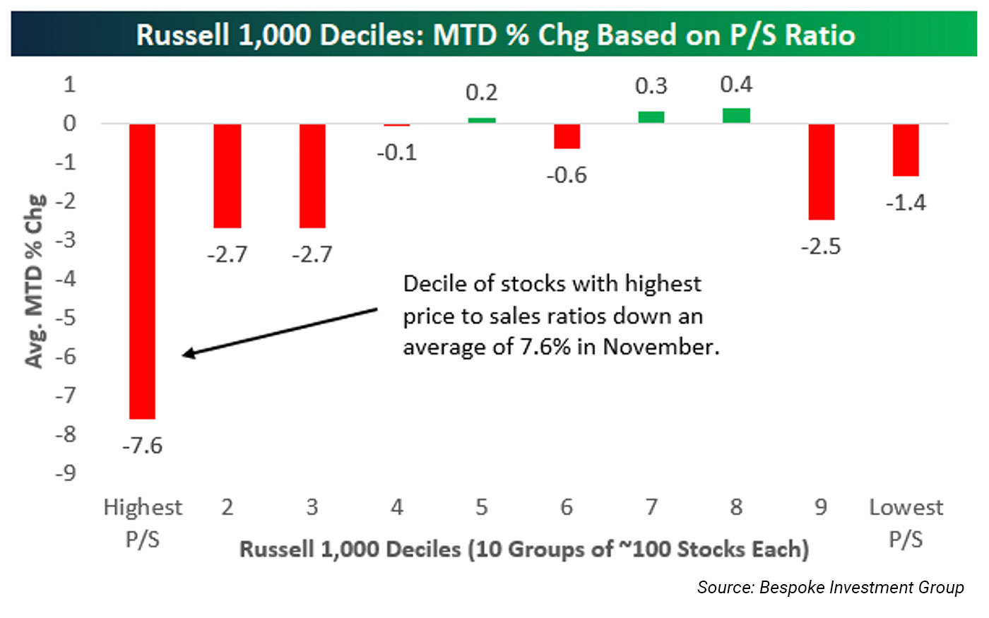 Bespoke Investment Group highlighted another dynamic shaping markets this month: When the Russell 1000 is divided into deciles based on price-to-sales (P/S) ratio, the decile of stocks with the highest P/S multiples is down an average of 7.6% so far in November—the hardest-hit group in the Index. Yet this same decile has also produced the strongest year-to-date returns, more than double those of any other decile.