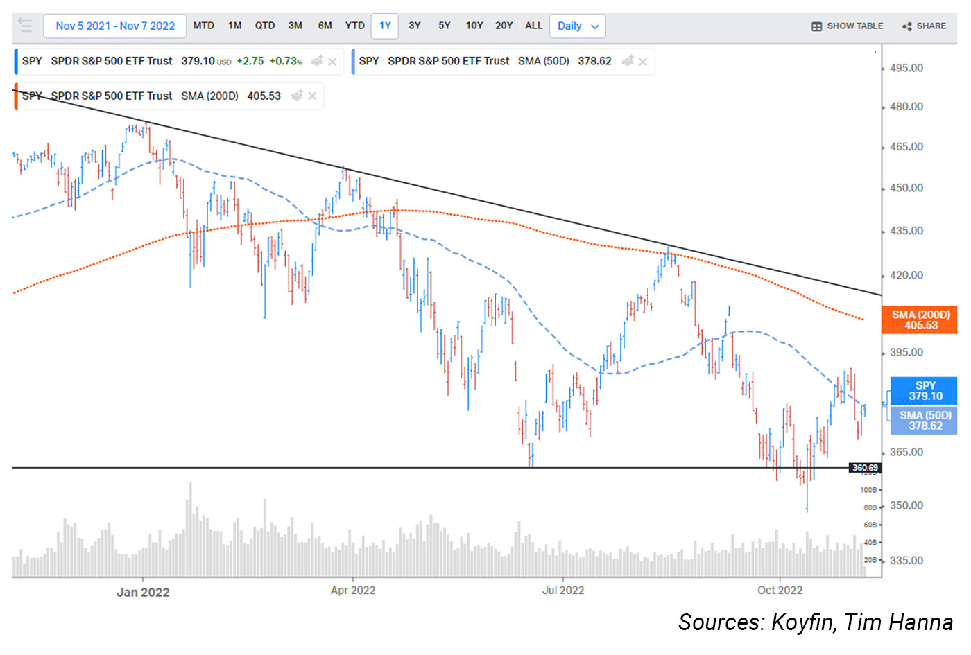 The S&P 500 Index traded below yearly lows set in June during the first half of October (the black horizontal line on the following chart) and then rallied to its 50-day moving average the second half of the month. The Index remains in its downward-sloping bear price channel, with bear market rallies unable to turn the longer-term trend positive. The upper trend line (the black negative-sloping line on the following chart) has remained in effect since the peak in January. Currently, price is trading around the middle of the channel and the S&P 500 is attempting to regain price action above the 50-day moving average. If successful, the next level of resistance would be at the 200-day moving average. The 200-day is a measure widely used by technicians to identify long-term trends and levels of support and resistance. Interestingly, October was the best monthly performance for the Dow Jones Industrial Average since 1976.