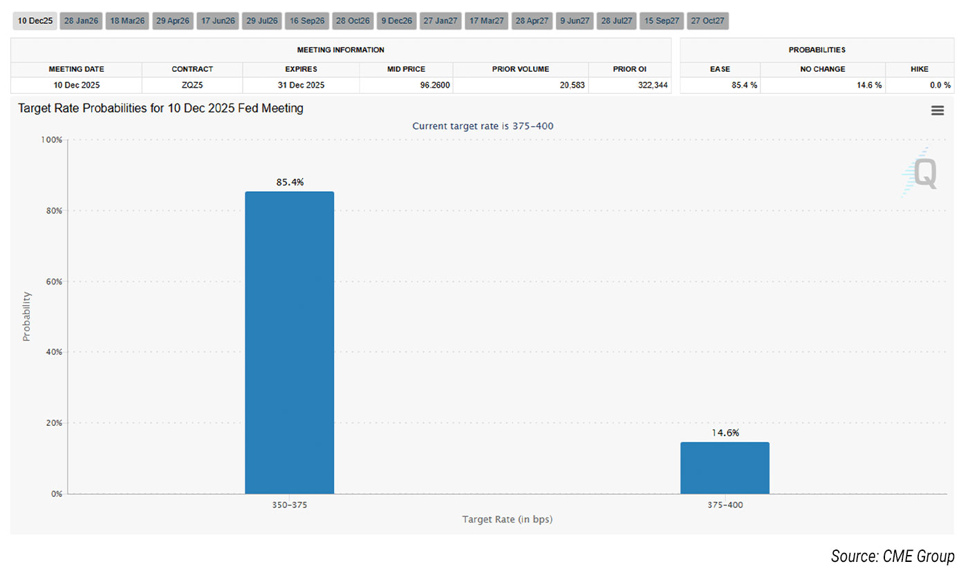 The next Fed meeting is on December 10. According to CME Group’s FedWatch tool, investors currently see a high likelihood of a 25-basis-point rate cut at that meeting. When the decision comes out, investors will also be looking for clues about the potential for additional cuts in 2026.