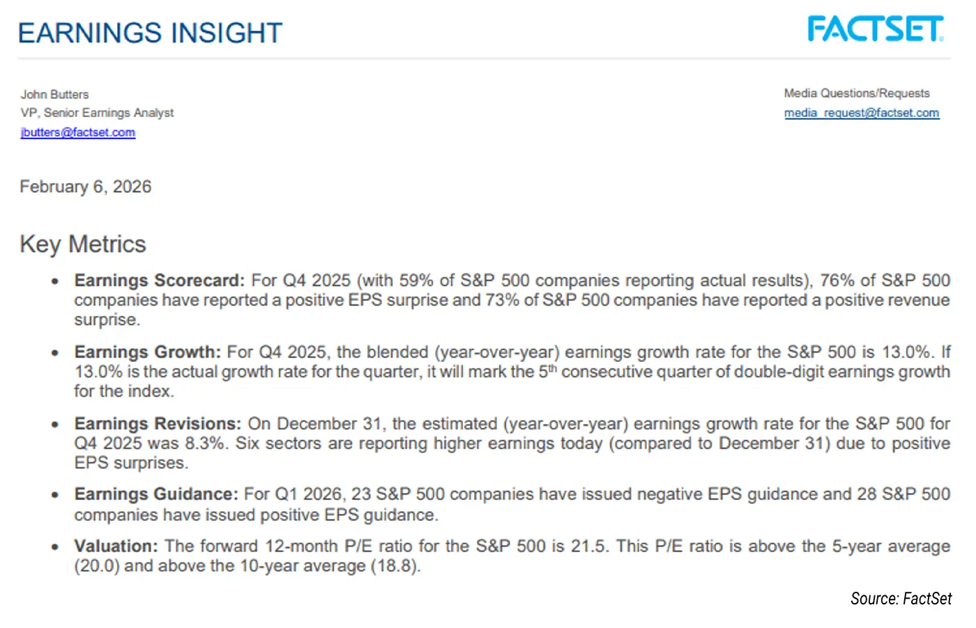 Investors continue to digest fourth-quarter earnings reports. Results have generally met or exceeded expectations, and the broad market has remained near 52-week highs. According to FactSet’s Earnings Insight report, more than half of S&P 500 companies have reported results so far. Among those firms, revenue and earnings-per-share surprises have skewed to the upside. Blended earnings growth currently stands at 13%, a very healthy number. Valuations sit above both the five-year and 10-year averages, reflecting that strength.