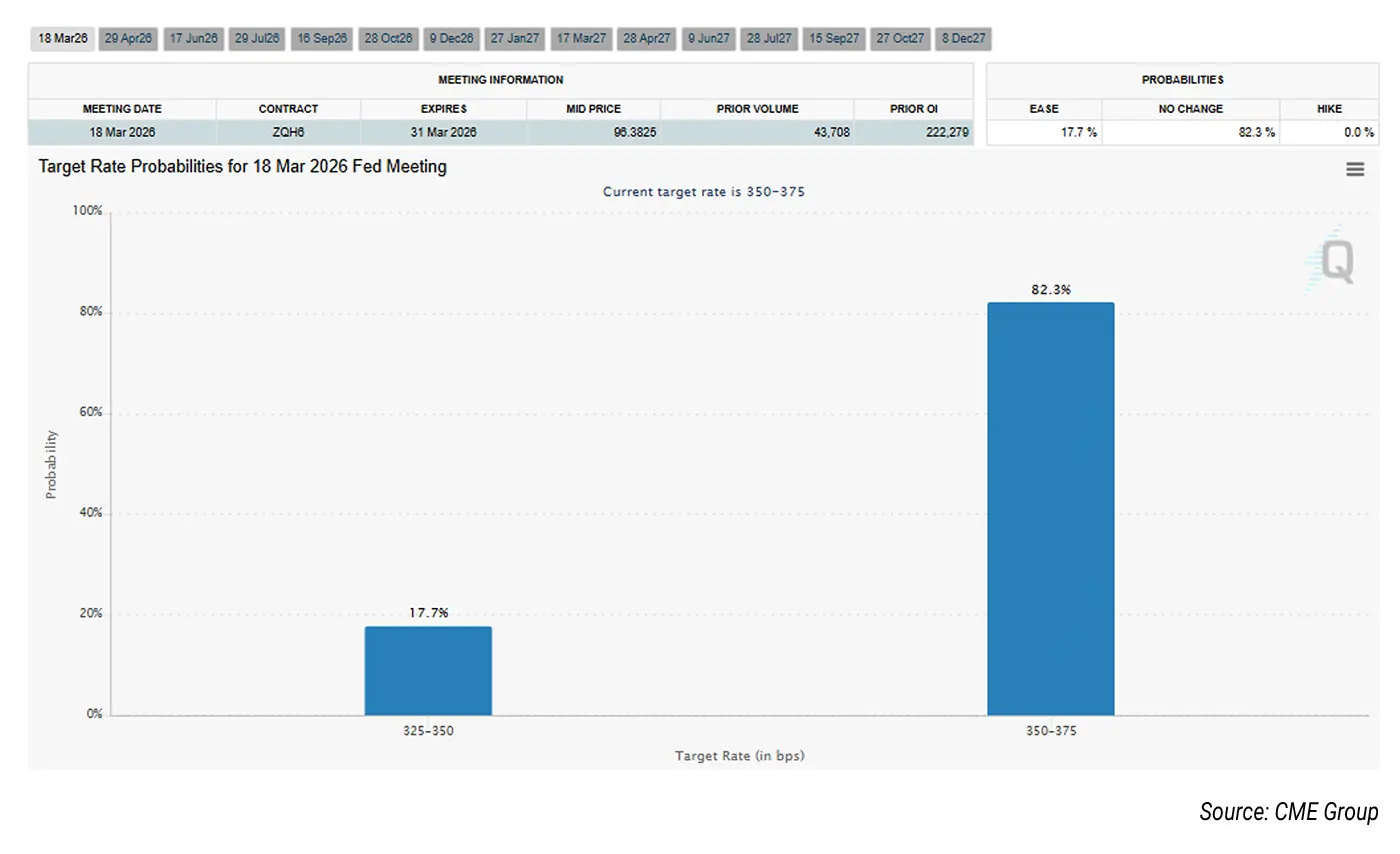 At its January meeting, the Federal Reserve left interest rates unchanged. Two policy meetings remain before Powell’s term ends, with the next scheduled for mid-March. According to CME Group’s FedWatch tool, market expectations currently point to no rate change at that meeting.