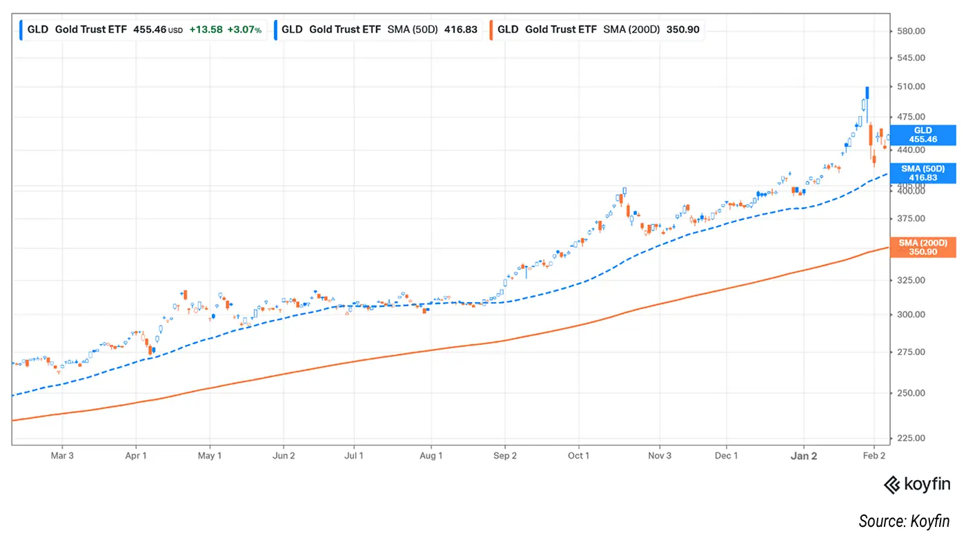 The SPDR Gold Shares ETF (GLD), which tracks the price of gold, finished the week above both its 50-day and 200-day moving averages.