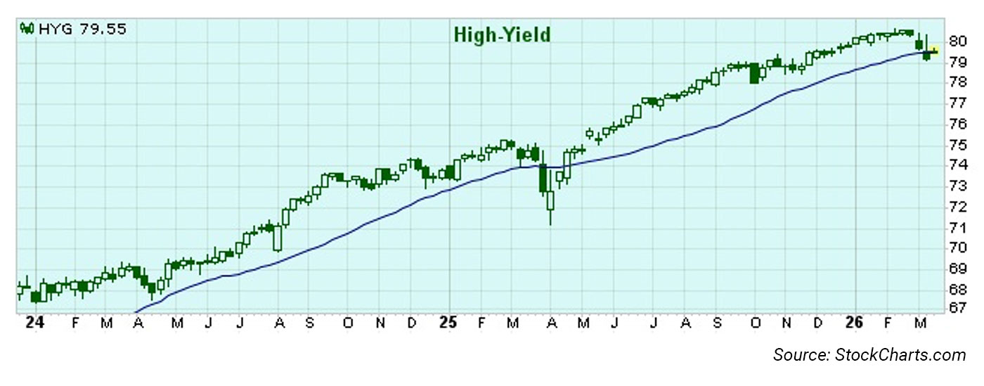 Meanwhile, the high-yield bond market has fallen rapidly from its latest new high. Like stocks, though, it has fallen so quickly that the asset class has moved into oversold territory, an area from which it has historically moved higher.