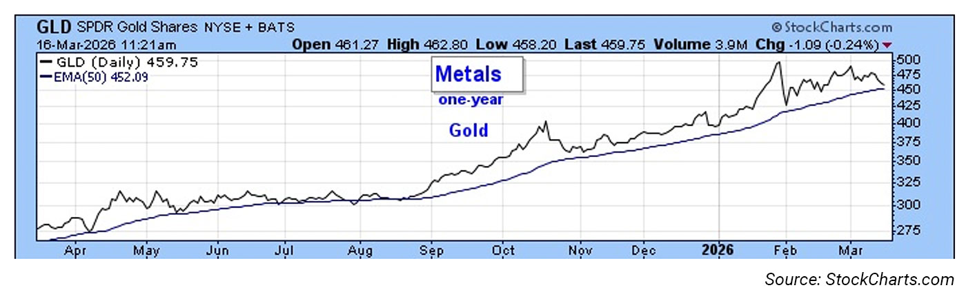 While gold has historically provided defense for portfolios when stocks have declined, so far it has failed to do so. It has, however, stayed above its intermediate-term moving average, though it has been trading mostly below $5,000 per ounce during the three-week stock market decline.