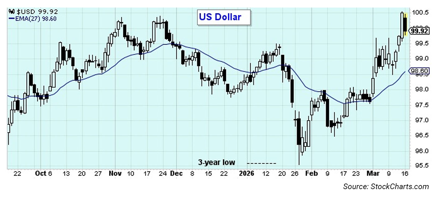The traditional contrarian relationship between gold and the U.S. dollar has continued. As the following chart shows, the dollar has moved higher alongside rising interest rates, while gold has fallen. To some extent, U.S. energy self-sufficiency may be contributing to a reemergence of the dollar’s safe-haven status during times of global uncertainty.