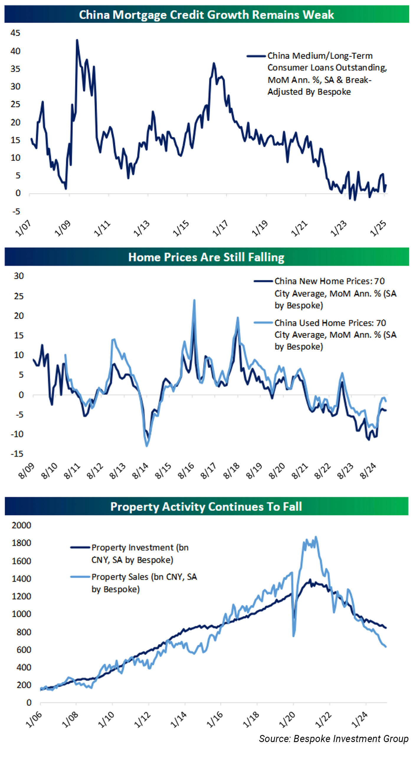 First, mortgage credit growth in China remains weak. Without new borrowing growth to leverage demand, home prices have continued to decline despite last year’s stimulus efforts. Additionally, property activity continues to fall, with new lows in both investment and sales—key components of the broader property value chain.