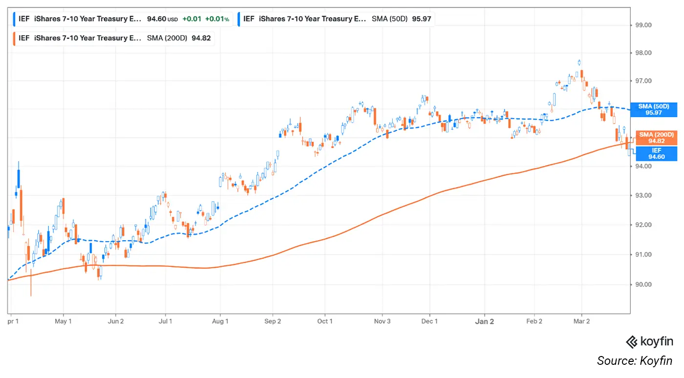 The iShares 7-10 Year Treasury Bond ETF (IEF), which tracks intermediate-term Treasury bonds, finished last week below both its 50-day and 200-day moving averages.