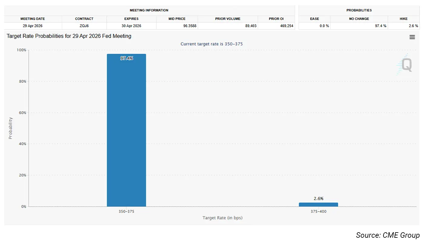 The next meeting of the Federal Open Market Committee is scheduled for the end of April. According to CME Group’s FedWatch tool, markets are currently pricing in a high probability that rates will remain unchanged at the meeting.
