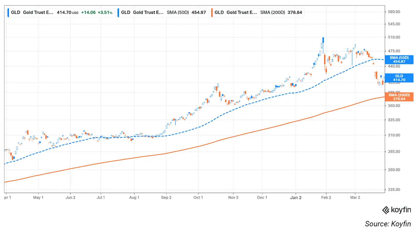 The SPDR Gold Shares ETF (GLD), which tracks the price of gold, finished the week below its 50-day moving average but above its 200-day moving average.