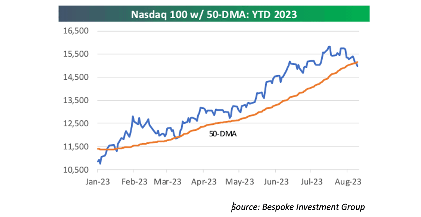 The S&P is down 2.8% and the NASDAQ is down 4.6% so far this month. According to Bespoke Investment Group, August is a traditionally weak month for stocks, and a modest decline in equity prices is typical. However, from a technical standpoint, the current weakness in the NASDAQ is notable. This week, the NASDAQ 100 broke below its 50-day moving average, driven predominantly by the major mega-cap tech names at the top of the index: Apple, Microsoft, Nvidia, and Tesla.