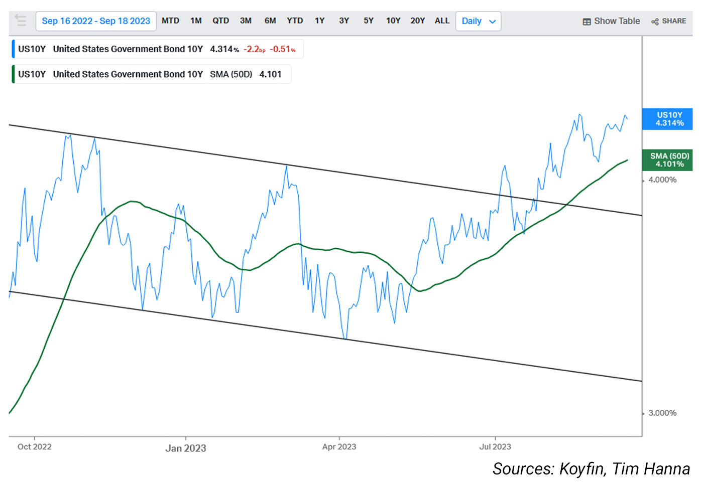 The 10-year Treasury continues to trade above its 50-day moving average, as indicated by the green line in the subsequent chart. This follows the July breakout of the downtrending price channel, represented by the black lines on the chart. Should it surpass the August peak, it won’t just set new 1-year highs but will also mark new 10-year highs.