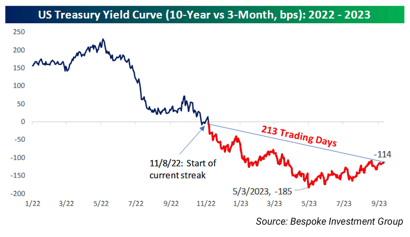 Friday (September 15) saw the yield curve inversion reach a record 213 trading days. This surpasses the previous notable streaks of 207 days ending in April 1980 and 209 days ending in May 2007—the only streaks to even come close.